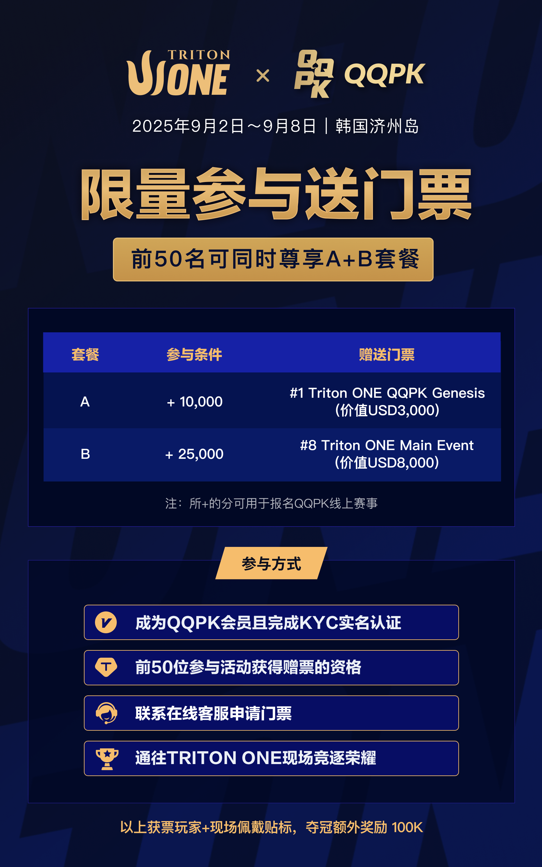 全球瞩目的扑克盛会Triton ONE首站系列赛将于2025年9月2日至8日正式登陆济州岛!在QQPK官宣成为triton one首站冠名赞助商后,Triton Poker Series首席执行官Andy Wong表示:“我们非常高兴正式宣布QQPK成为Triton ONE的冠名合作伙伴。我们的使命是让更多玩家有机会接触并热爱这项运动,而此次合作将Trito...