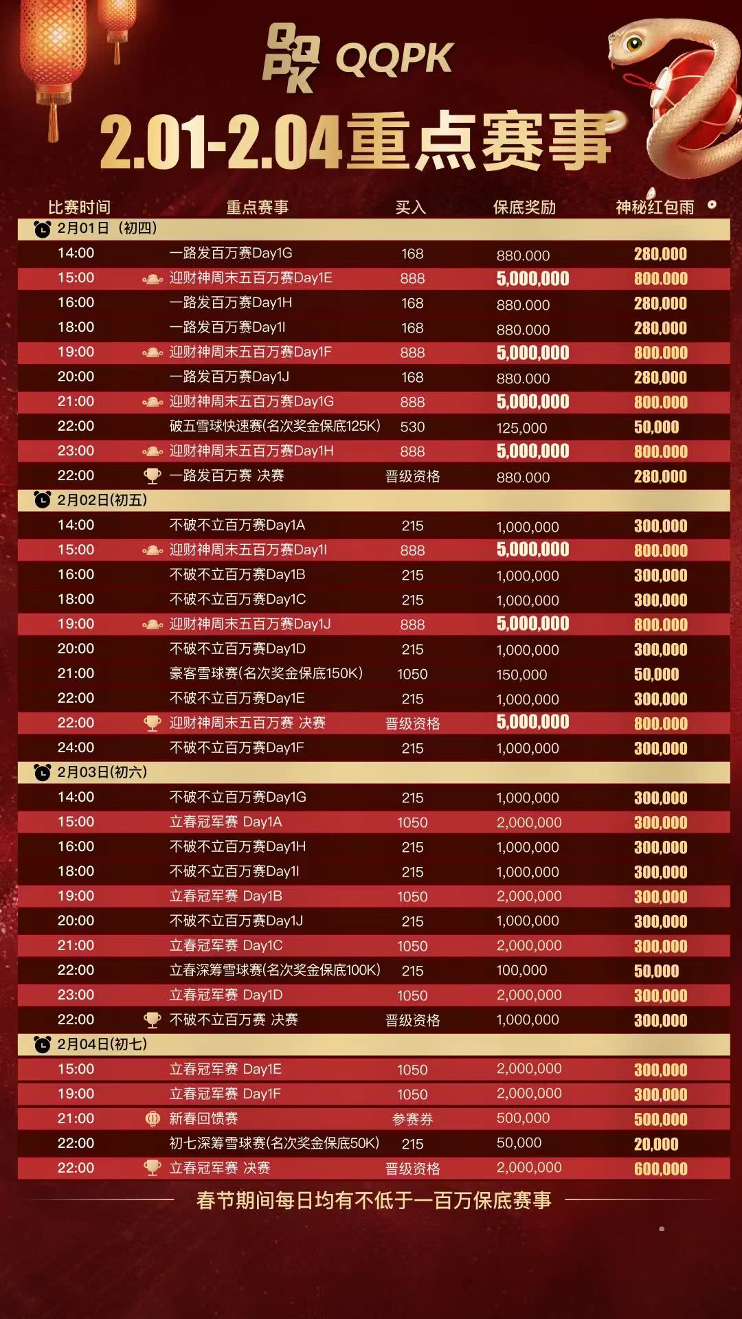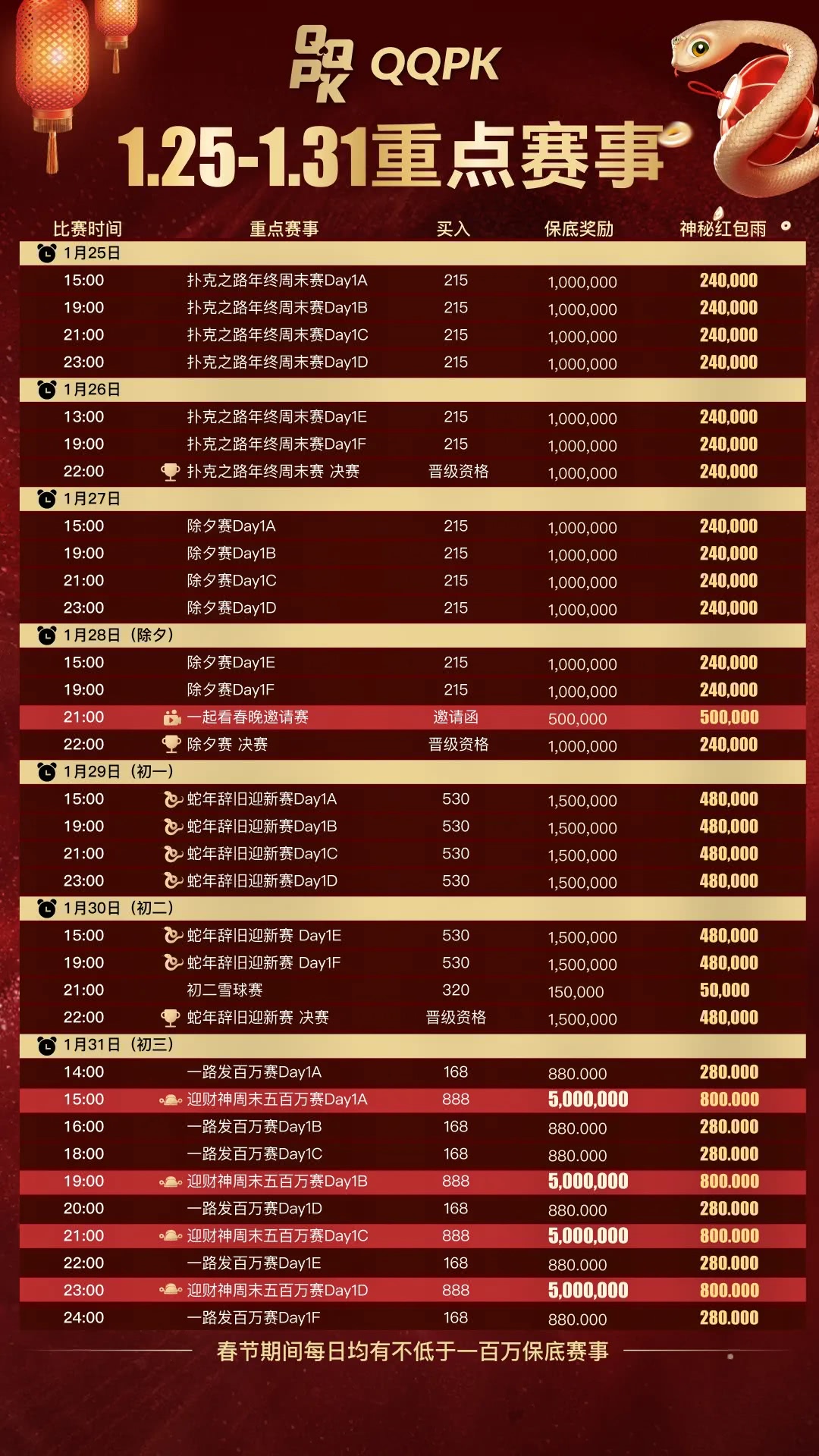 QQPK X 17POKER 春节期间推出重磅赛事,自1月25日至2月4日,每日都有百万保底的大型比赛!除夕夜更有免费参与的百万保底赛事以及1月31日的重磅迎财神五百万赛,陪您共同守岁,喜盼蛇年!