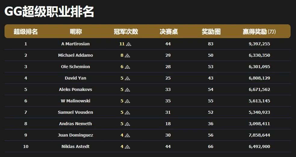 在过去两年的战绩榜上,年仅27岁的俄罗斯传奇高手Artur Martirosyan独占鳌头,豪取11座冠军、跻身44次决赛桌,总奖励累计高达近940w刀!