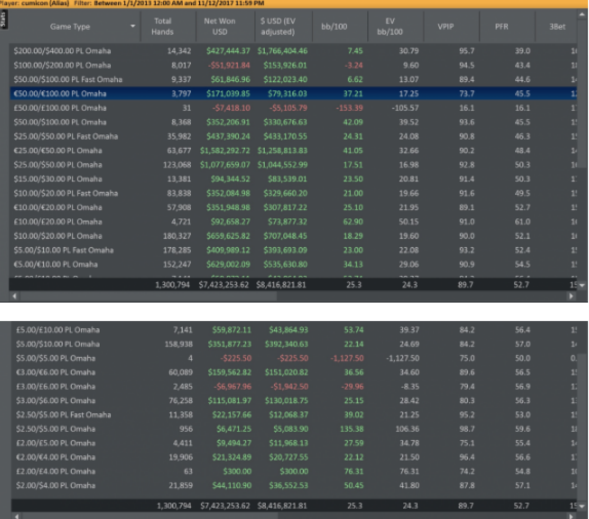 但数字不会说谎:他在5/10级别赢了140多万,10/20赢了150万,25/50赢了300万,每百手牌净赚25个bb。