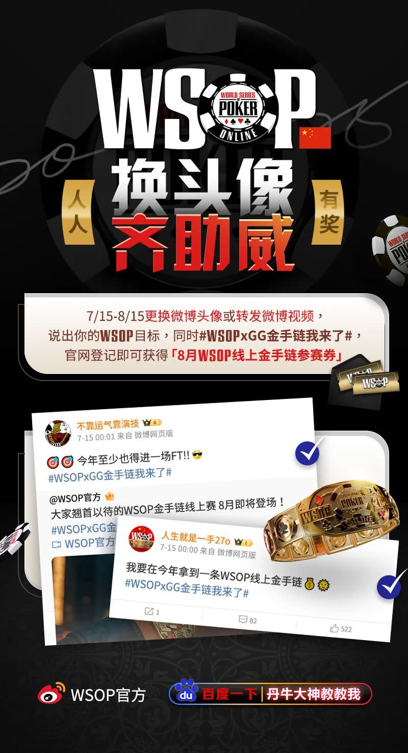 『WSOP换头像齐助威』活动上线后一周内反应热烈,已有众多扑克爱好者换上头像、转发视频、留言许愿,也为自己争取到8月WSOP金手链线上赛的参赛机会!
