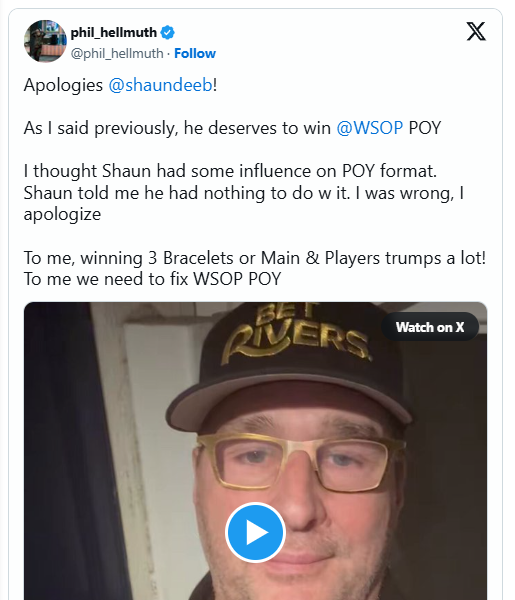 "赢家就是赢家!这不是对@WSOP的指责:2025年WSOP办得棒极了!致敬所有工作人员、裁判和发牌员!这也不是对@shaundeeb的否定:他今年表现优异,完全按照公布的规则公平赢得了年度玩家(POY)。这是对WSOP年度玩家积分制度的质疑。"
