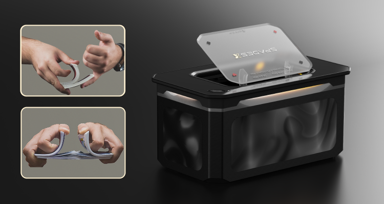 SpadesX斯倍德洗牌机深知国际扑克高频洗牌、洗牌麻烦的痛点问题,采用全自研机械传动及自动化专利技术,配合全自研科学随机洗牌策略,实现了简洁、高效的仿生人手洗牌的方式,同时确保洗牌结果独立、随机且无法预测。