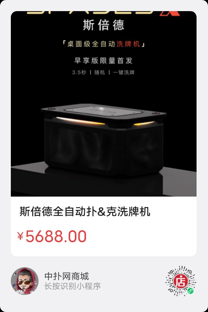 本次SpadesX斯倍德洗牌机原价$888美元,中国大陆地区首发价$800美元,限量188台,下订成功即可获赠: