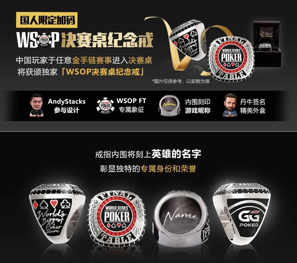 也别忘了,中国玩家只要于任意33场金手链赛事进入Final Table,就将获颁独家“WSOP决赛桌纪念戒”,纪录你的不朽成就!