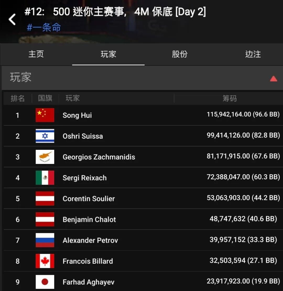 在这片热闹的战场上,目前剩下最后九位玩家幸存。而值得注意的是,来自中国的宋辉(Song Hui,昵称sh555)正以暂居第一的记分牌领跑决赛桌!