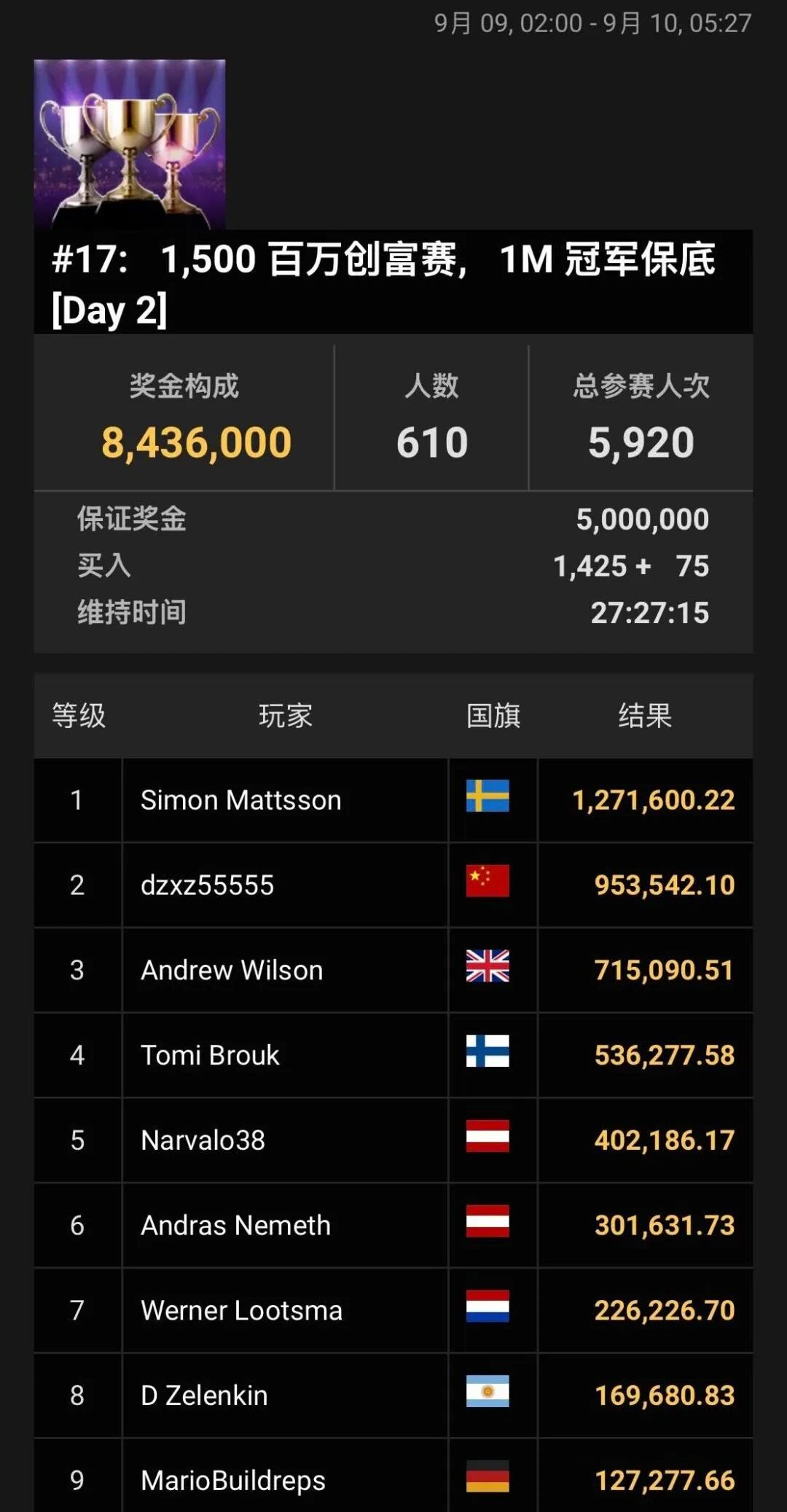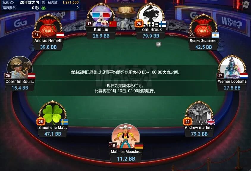 当中有610人闯入前圈,最低奖励为2,981刀。比赛于Final Table九人就座时暂告一段落,并在北京时间9月10日02:00重新开始,向冠军荣耀发起最后冲刺。
