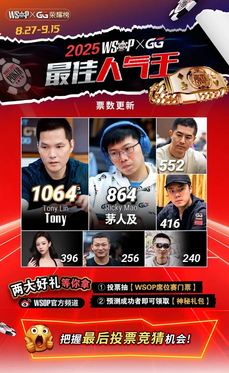 投票结果将在【WSOP官方频道】微博实时更新,并于9月16日揭晓最终榜单与派发竞猜奖励
