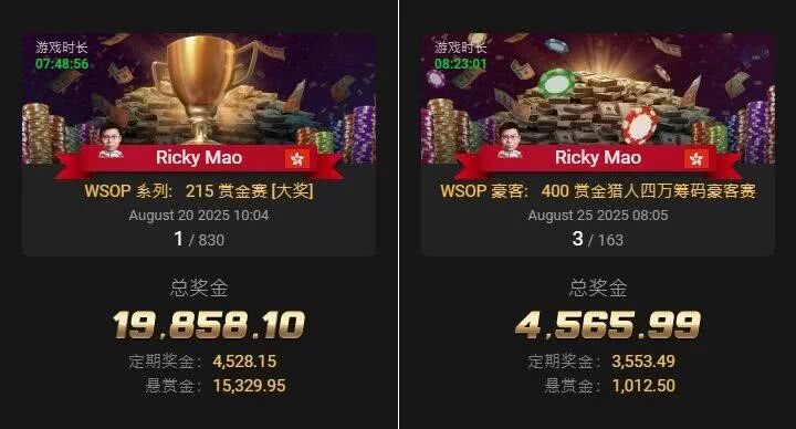 而这些,都还只是现场赛事而已。身为GGTeam China大使,茅人及在2025年《GGPoker WSOP线上金手链系列赛》期间,屡屡收获高额赛佳绩,完全展现其之所以为代言人的强劲实力。
