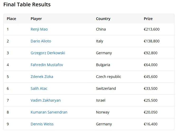 进入六人桌后,比赛僵持逾一个半小时,直到茅人及在与Salih Atac (第6名) 的AA vs AA对局中,河牌击中顺子才打破平衡。