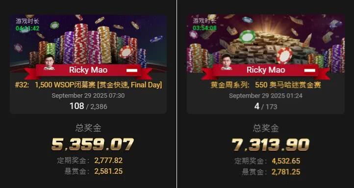 有趣的是,在夺得第二条金手链之前,茅人及正一边打着线上WSOP闭幕赛,一边多开冲刺GG《国庆中秋生肖狂欢赛》排行榜,目前暂居第27名,可谓“铁人”般的参赛意志力,关键是还都能出成绩!