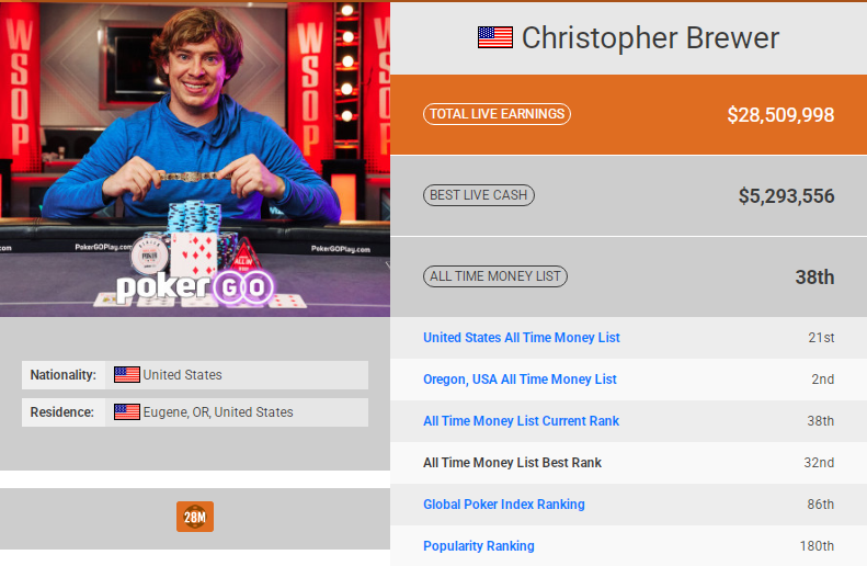 在2024年5万刀买入WSOP职业玩家冠军赛(被誉为“最难打的赛事”)中,Brewer一度筹码领先,最终止步第三名,收获51.9万美元奖金。