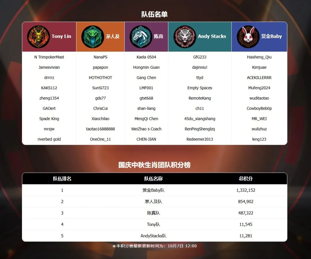 虽然赏金Baby队目前暂居第一,但茅人及队拥有多位高分选手,从9月28日开赛至今始终保持强势表现,展现出坚实的整体实力。
