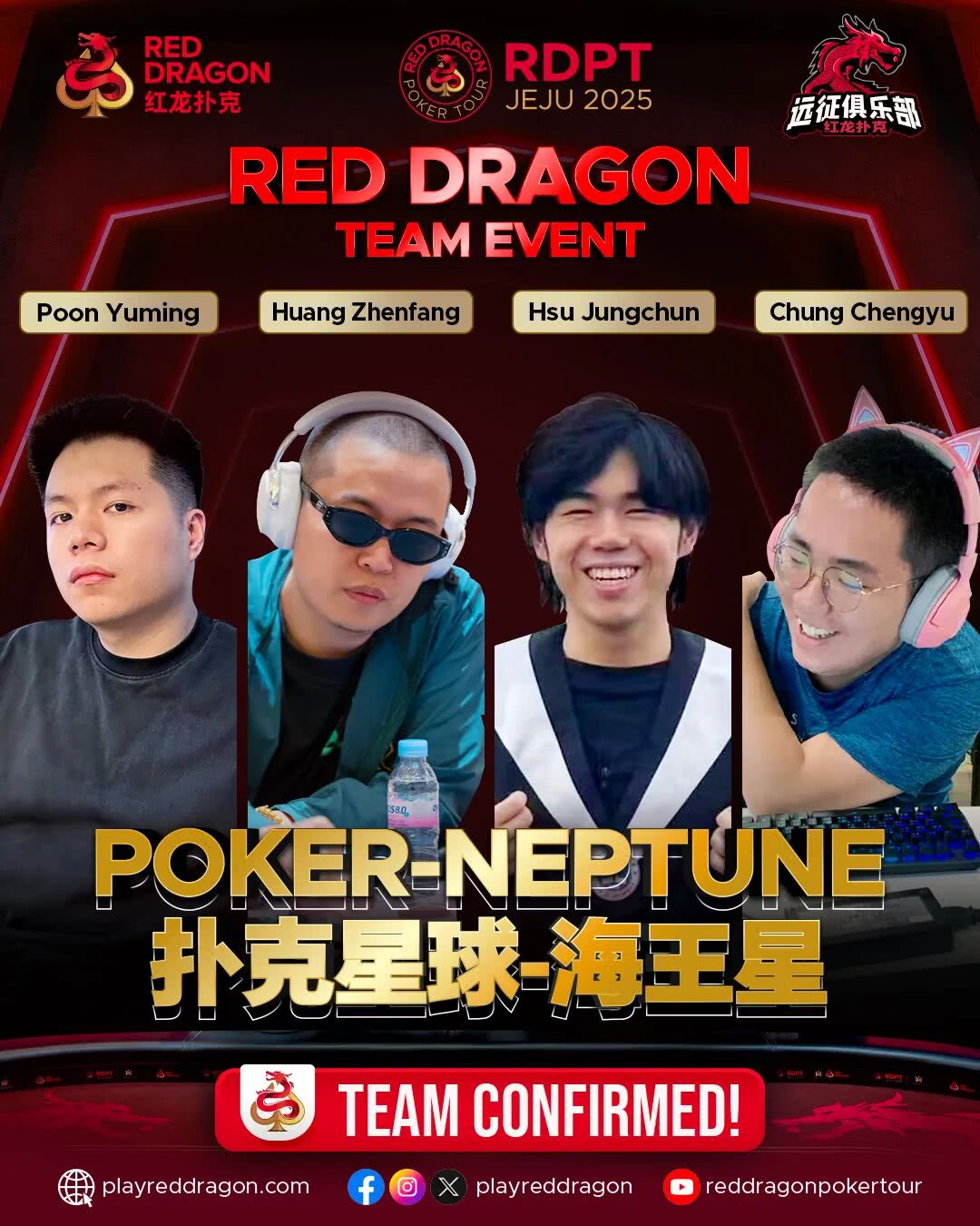如果说火星队胜在章法,海王星队则赢在独特的混搭气质。这支由港台同胞以及大陆玩家组成的战队,把跨地域组队玩出了新高度:保险从业者荣骏、留学咨询顾问小潘;社群运营韩吉;MCN公司创始人、上届红龙杯神秘龙珠赛最大金蛋得主大方,四个不同行业的扑克爱好者,因红龙赛事意外同频。