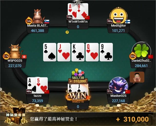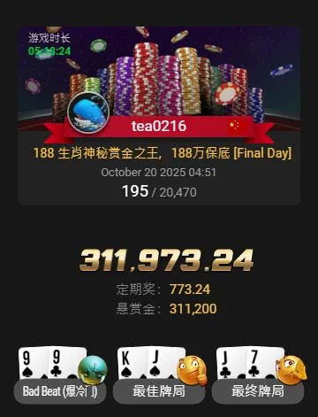 回顾比赛开打仅1小时12分钟之时,他就在一手三人跑马牌局中胜出,淘汰对手的同时竟成功解锁310,000Top神秘赏金,羡煞众人!