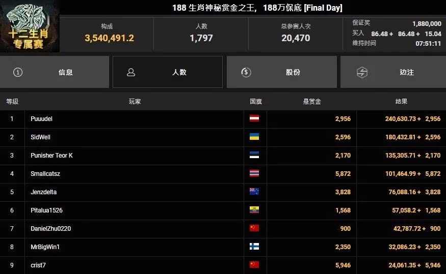 至于中国选手部分则有两人勇闯决赛桌,分别是第七名的Zhu Feican (昵称DanielZhu0220),奖励43,688;以及第九名的Wang Xin (昵称crist7),奖励30,007,恭喜他们均实现了超过160倍回报。