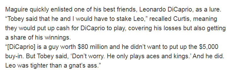 他在书中提到高额私局合伙人托比·马奎尔(《蜘蛛侠》扮演着)利用李奥纳多·迪卡普里奥的名气,把小李子当“诱饵”吸引更多豪客入局。