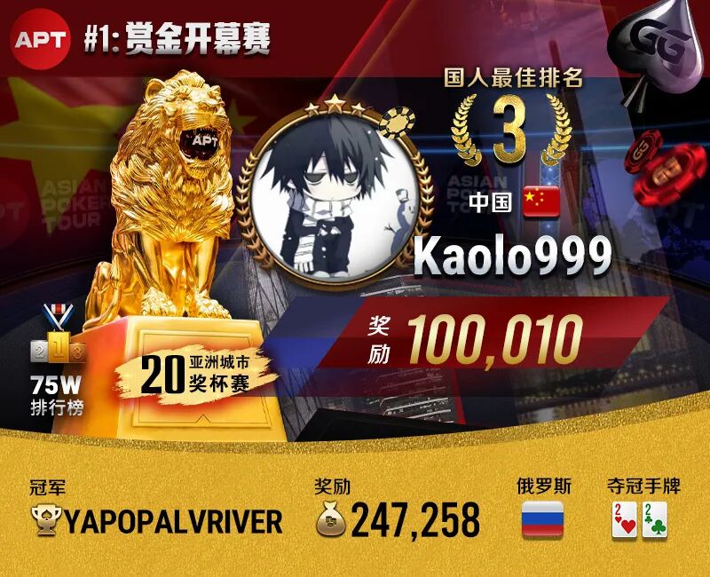 《APT亚洲扑克线上巡回赛》10月26日至11月16日在GGPoker热闹登场!总保底高达180,000,000,20场奖杯赛均设在晚间20:00和21:00开打。