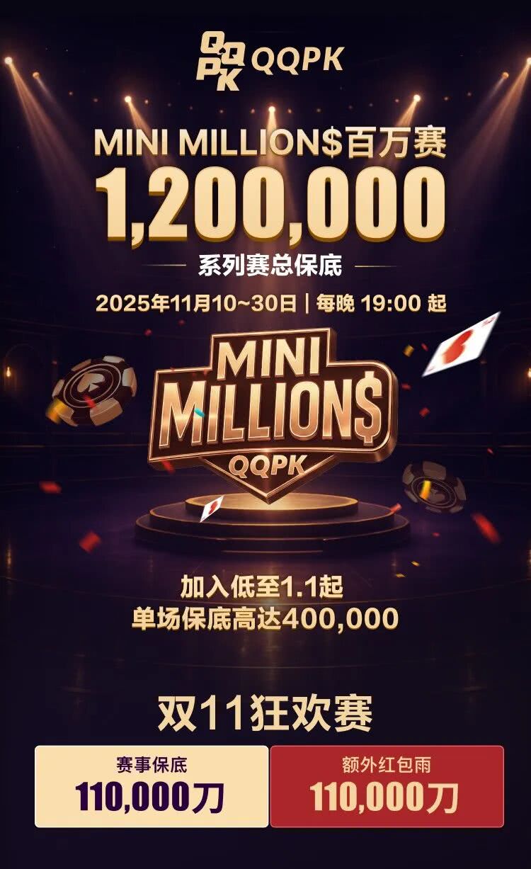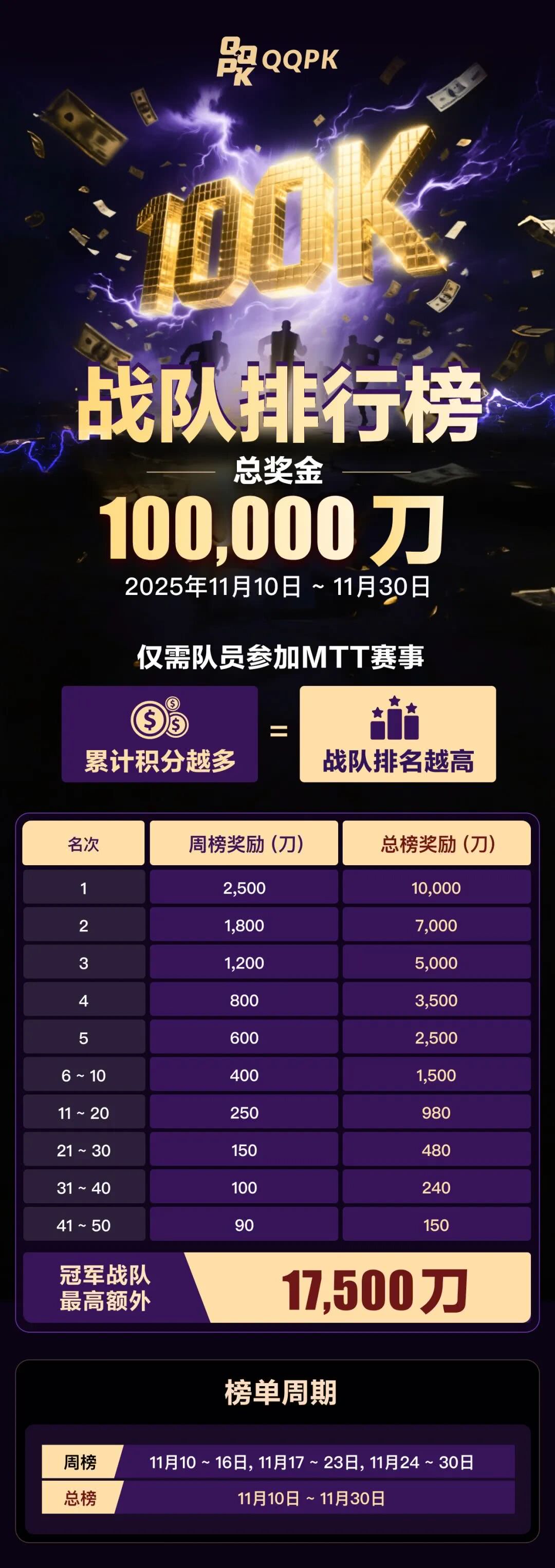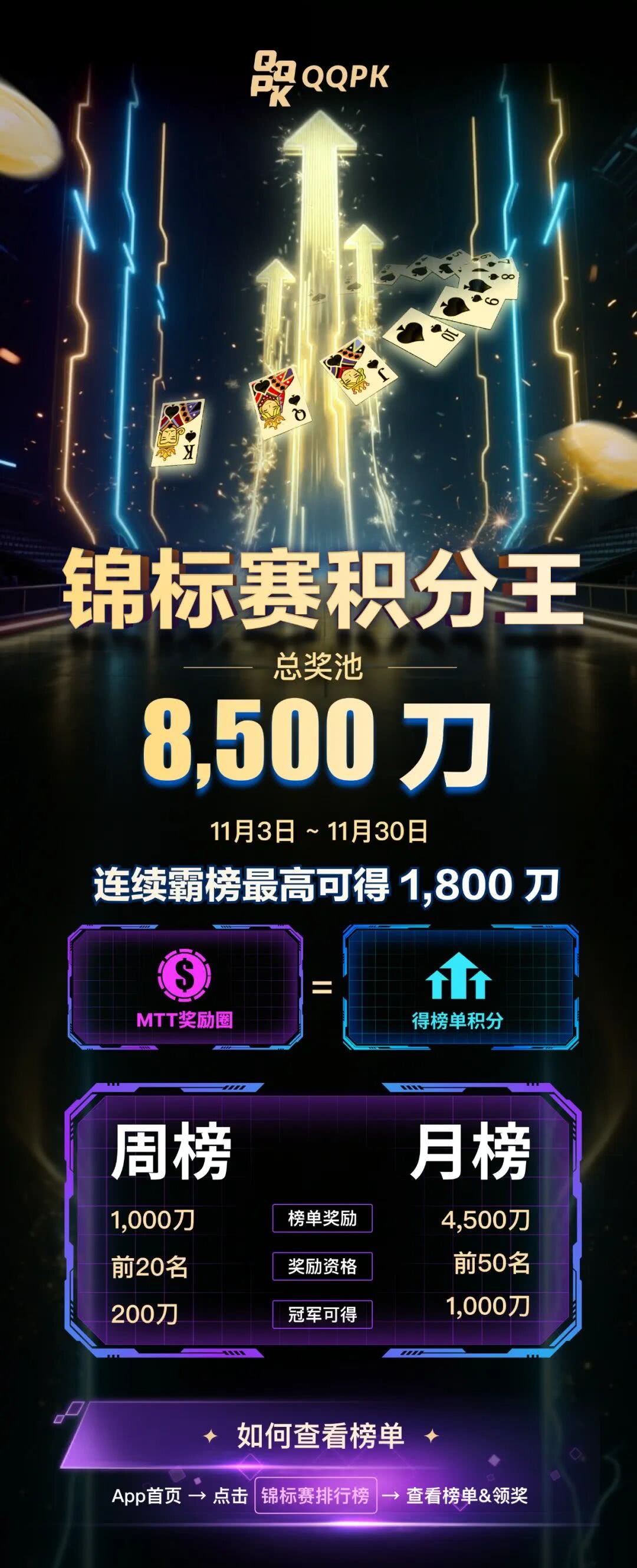 正如我们所说,扑克是一场与波动共舞的长期竞技。而在这个十一月,QQPK为每一位热爱扑克的你,准备了一场融合个人技术与团队荣耀的扑克狂欢——总奖池叠加超过120万刀,等你来挑战!